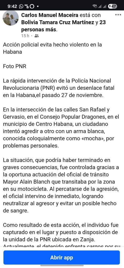 El pasado 27 de noviembre, en la intersección de San Rafael y Gervasio, en el Consejo Popular Dragones del municipio de Centro Habana, un altercado entre dos ciudadanos terminó con la intervención directa de un oficial de tránsito que pasaba por el lugar. Según la información difundida por la Policía Nacional Revolucionaria, uno de los implicados intentó agredir al otro con un arma blanca conocida popularmente como mocha, en un conflicto originado por problemas personales entre ambos.