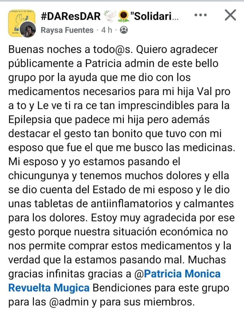 Por suerte, a cada rato aparecen en las redes también «pequeñas victorias». Alguien que se encuentra un celular perdido, un monedero, un bolso dentro de un auto; documentos… O gente como Raysa Fuentes, que en el grupo de Facebook Dar es Dar, expresó su admiración hacia una cubana nombrada Patricia quien, en momentos en que todo el mundo vende todo, porque de alguna manera hay que tener dinero para poder comer, decidió regalarle – no venderle, nunca venderlo – dos medicamentos valiosos como el Valproato de Sodio y el Levetiracetan, para su pequeña hija.