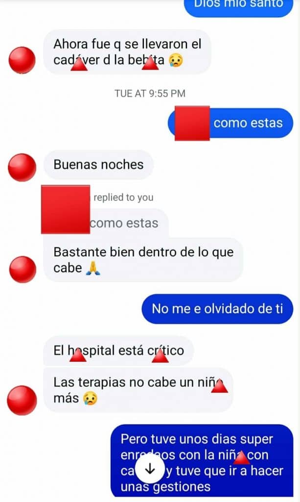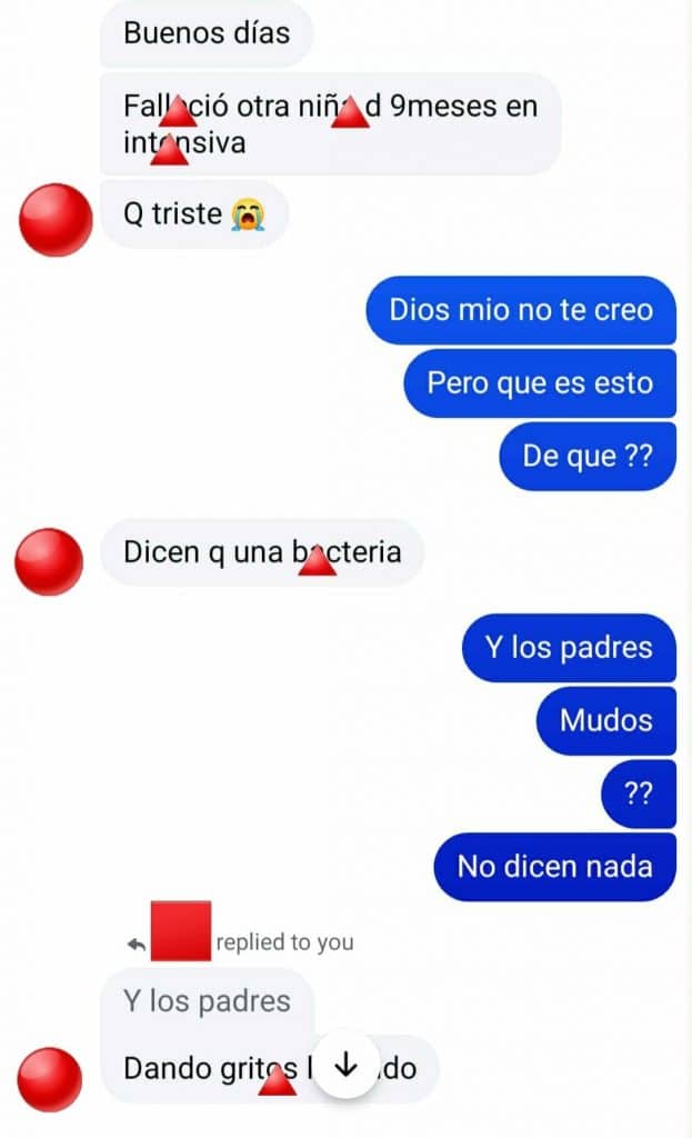 Mensajes de chat compartidos por el músico y activista Saúl Manuel refieren que la niña estuvo en terapia y que “el hospital está crítico”, con salas “donde no cabe un niño más”. En esas conversaciones —cuyas identidades fueron reservadas— se habla de un presunto cuadro “por una bacteria”, extremo que no ha sido confirmado de forma oficial.