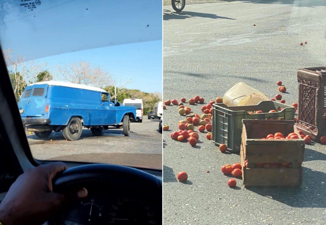 Imágenes divulgadas por testigos muestran los tomates esparcidos sobre el pavimento, así como a los peritos del Minint inspeccionando la zona. A juzgar por las fotos, la parte frontal del almendrón quedó severamente afectada después de chocar de frente con la camioneta.