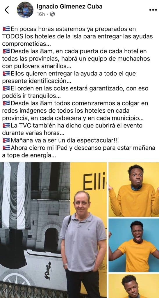 Este nuevo bulo fue creado por el español Ignacio Giménez, conocido por difundir engaños, lo cual hizo que, en medio de la precaria situación que atraviesa el país, muchos cubanos acudieran a los hoteles en busca de “donaciones”.