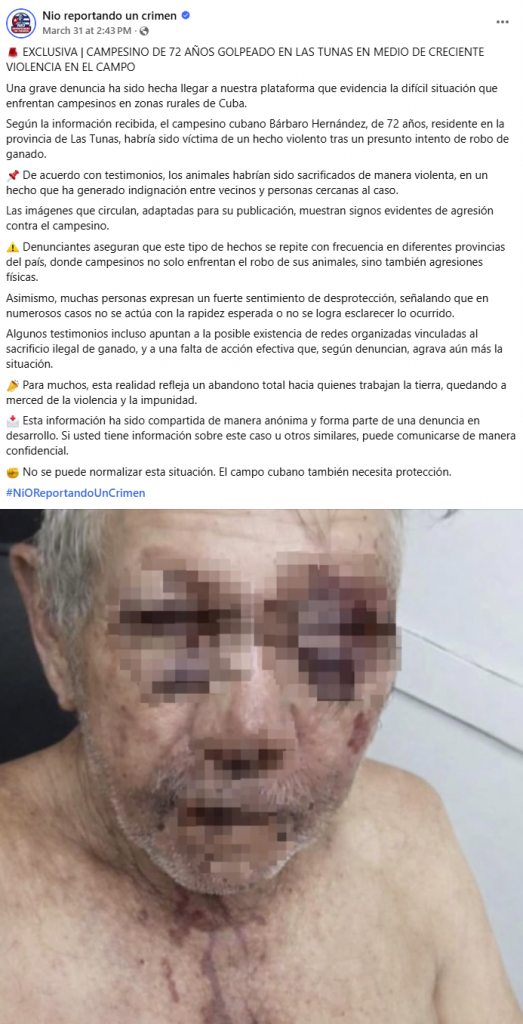 La denuncia empezó a circular por una página de Facebook ajena a la prensa oficial y con un tono de alarma que se repite cada vez más en Cuba: un campesino de 72 años, identificado como Bárbaro Hernández, habría sido golpeado brutalmente en la provincia de Las Tunas en medio de un hecho violento ligado al robo en zona rural.