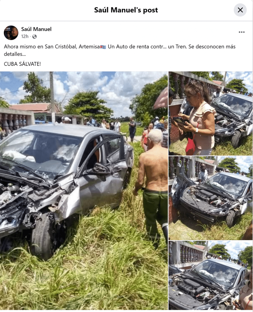Un nuevo accidente de tránsito en Cuba volvió a encender el debate sobre la imprudencia al volante y las fallas en la seguridad ferroviaria. Esta vez ocurrió en San Cristóbal, Artemisa, cuando un auto de turismo —un vehículo de renta— impactó contra un tren en un paso a nivel sin barreras.