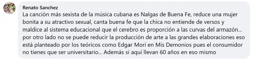 Pero… Hay un detalle que redondea todavía más la contradicción. El propio texto de Granma abre citando versos del ya mencionado Buena Fe como si estuviera echando mano de un referente ético y sensible frente a la violencia de género. Pero Buena Fe tiene en su catálogo una canción titulada Nalgas, incluida en el disco Presagios, cuyo eje es precisamente la exaltación del cuerpo femenino desde un yo lírico masculino que se confiesa “presa del machismo ancestral” y reduce a la mujer a su atractivo físico: “Nalgas, dos joyas del baile, lírica del tacto”, dice la letra.