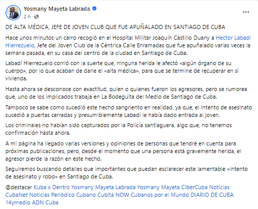 Según Yosmany Mayeta Labrada, un periodista independiente que ha seguido el caso, Labadí, de 53 años, no sufrió daños a órganos vitales, una circunstancia afortunada que contribuyó significativamente a su supervivencia. A pesar de la gravedad del incidente, fue dado de alta y continúa su recuperación en casa. Los motivos detrás del ataque aún no se han esclarecido, y la identidad de los agresores sigue siendo un misterio.
