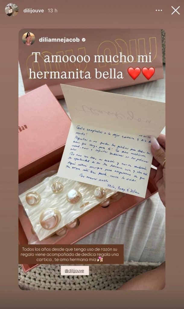 Según mostró La Dura en sus historias de Instagram, Diliam Jouve, su hermana mayor, menos mediática, pero igual de bella, le envió un regalo de cumpleaños acompañado como de un conmovedor mensaje escrito a mano.