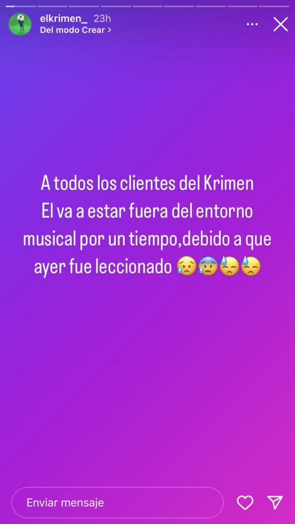«Buenos días, quiero darles la información de que El Krimen estará fuera del entorno musical por un tiempo debido a que ayer lo atacaron fuertemente y se encuentra lesionado», se compartió en la red social.