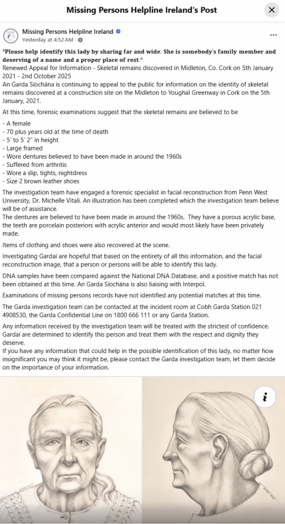 En el condado de Cork, el 5 de enero de 2021, trabajadores de una obra en la vía verde Midleton–Youghal hallaron restos óseos que, tras peritajes forenses, se arribó a la conclusión de que se trataba de una mujer de más de 70 años, de 1,52 m como máximo, complexión robusta y signos de artritis.