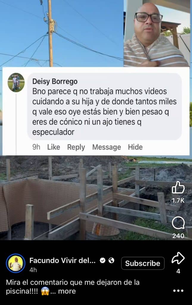 El humorista cubano Andy Vázquez, conocido por encarnar populares personajes como Facundo Correcto, respondió a una señora que lo tildó de especulador por mostrar el proceso de construcción de la piscina que ha estado haciendo en el patio de su casa en Cape Coral, Florida.