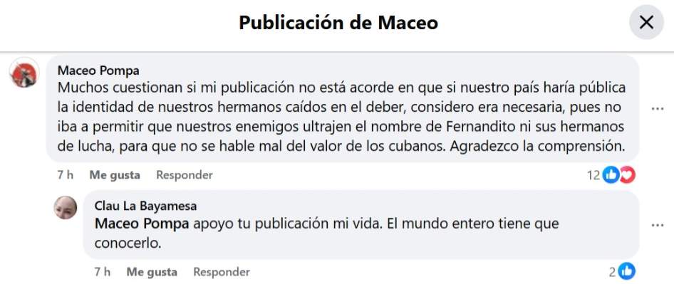 El perfil oficialista de un usuario que se hace llamar Maceo Pompa confirmó en Facebook el fallecimiento de “Fernando”, pero sin dar más detalles sobre su edad o su rango.