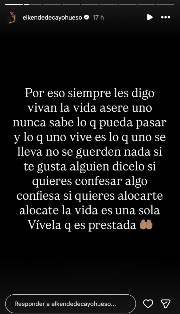 “Por eso siempre les digo: vivan la vida, asere. Uno nunca sabe lo que pueda pasar y lo que uno vive es lo que uno se lleva. No se guarden nada. Si te gusta alguien, díselo; si quieres confesar algo, confiésalo; si quieres alocarte, alócate. La vida es una sola, vívela, que es prestada”.