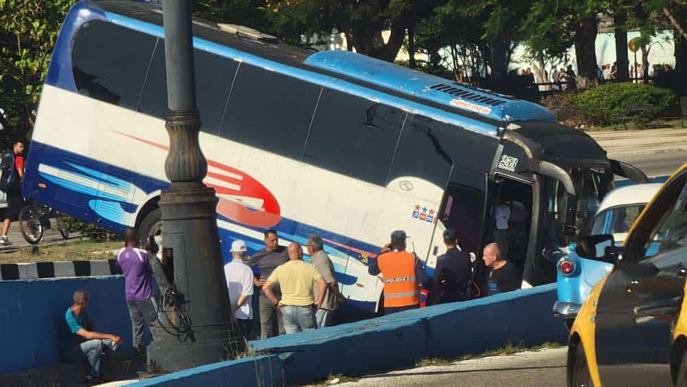 Varias publicaciones en redes sociales muestran al autobús del problema, que quedó haciendo malabares sobre un muro, a punto de caer a una calle inferior, así como a un almendrón rojo de techo blanco y un Lada de color blanco, los vehículos que tuvieron la mala suerte de estar en el trayecto de la guagua.