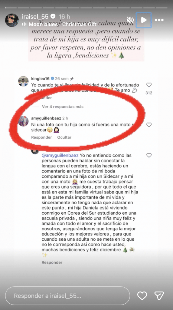 Lejos de ignorarlo, Iraisel respondió con un mensaje firme en el que pidió respeto y recordó que su prioridad siempre ha sido su hija. “Me cuesta trabajo pensar que eres una seguidora, porque todo el que está en esta mi familia virtual sabe que mi hija es la parte más importante de mi vida”, señaló.