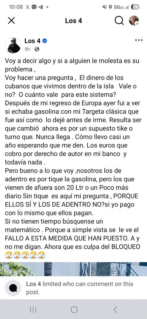 Jorge Hernández Carvajal, conocido artísticamente como Jorge Jr., líder y fundador de la agrupación cubana Los 4, volvió a usar sus redes sociales para quejarse de una medida estatal que, según él, discrimina a quienes viven dentro de Cuba frente a quienes llegan del exterior. En un post publicado en Facebook, el músico cuestionó el sistema de turnos o “tique” (ticket) para acceder al combustible con tarjeta clásica y preguntó por qué los cubanos residentes en la isla no pueden comprar gasolina en igualdad de condiciones si pagan “con lo mismo que ellos pagan”.