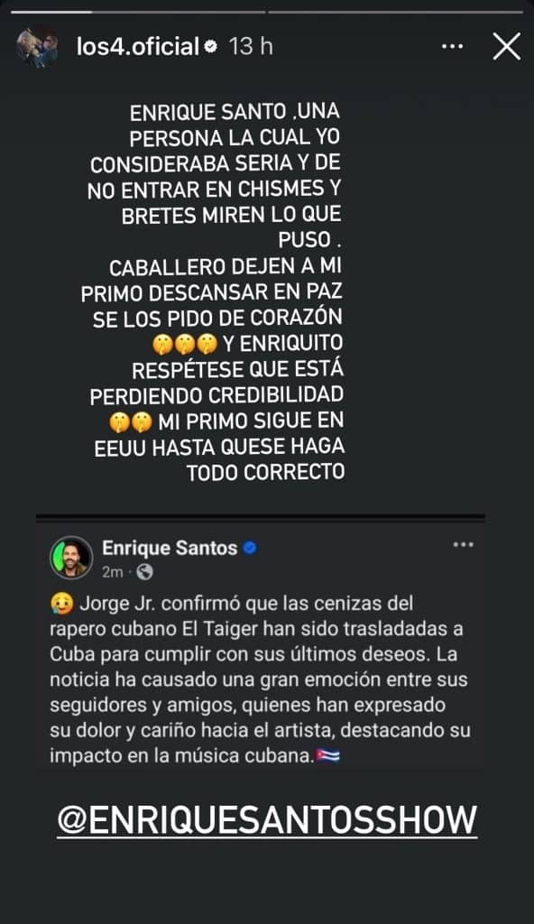 “Enrique Santos, una persona la cual yo consideraba seria y de no entrar en chismes y bretes, miren lo que puso. Caballero, dejen a mi primo descansar en paz, se los pido de corazón”, escribió Jorge Junior en una historia de Instagram el martes.