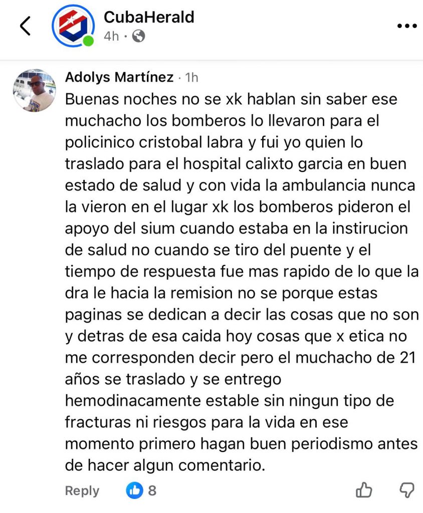 El internauta Adolys Martínez aclaró en el perfil de Cuba Herald en Facebook que los propios bomberos llevaron al joven, de 21 años, para el policlínico Cristóbal Labra.