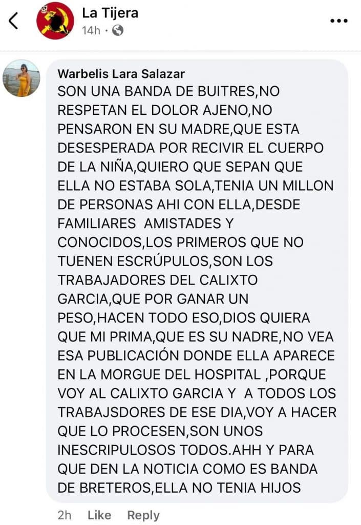 “Quiero que sepan que ella no estaba sola. Tenía un millón de personas ahí con ella: familiares, amistades y conocidos”, señaló la mujer al criticar que los trabajadores “sin escrúpulos” del Calixto García filtraran una foto del cadáver de su sobrina en la morgue del hospital.