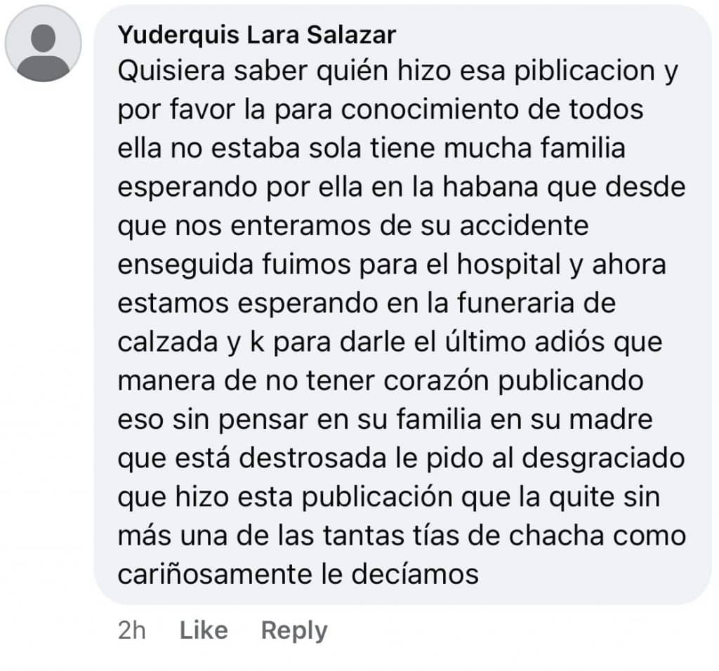 “Ella no estaba sola. Tiene mucha familia esperando por ella en La Habana, que desde que nos enteramos de su accidente enseguida fuimos para el hospital y ahora estamos esperando en la funeraria de Calzada y K”, confirmó otra de las tías de Chacha, Yuderquis Lara Salazar.