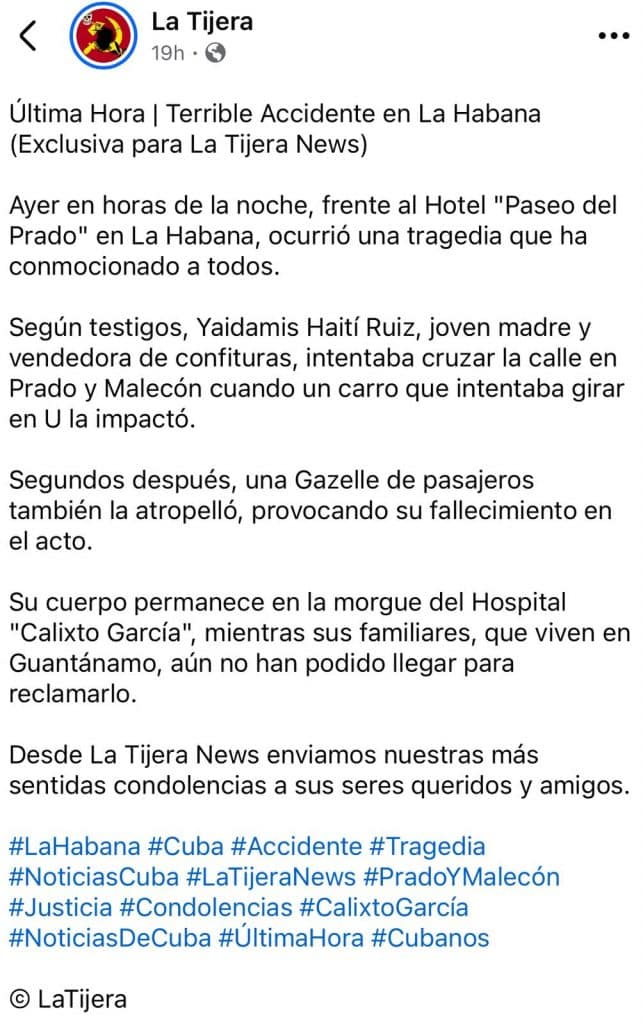 Según precisó la página de La Tijera en Facebook, la joven, natural de Jamaica (Manuel Tames), en Guantánamo, intentaba cruzar la calle en la esquina de Prado y Malecón, frente al Hotel Paseo del Prado, cuando fue impactada por un carro que intentaba girar en U y, “segundos después”, por uno de los metrotaxis conocidos como Gazelles.