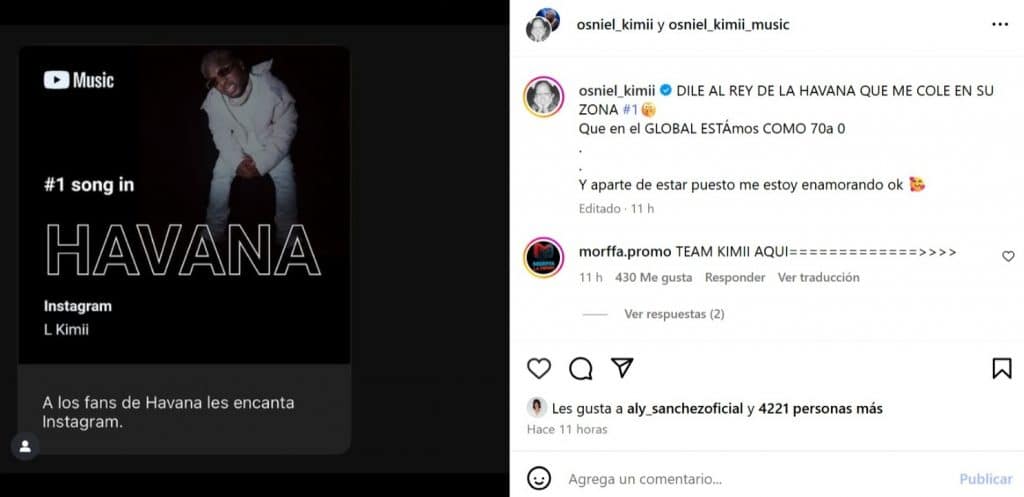 “Dile al Rey de La Habana que me colé en su zona #1. Que en el Global estamos como 70 a 0”, escribió en Instagram L Kimii haciendo clara alusión a Wampi, cuyo último disco lleva por nombre El Rey de La Habana.