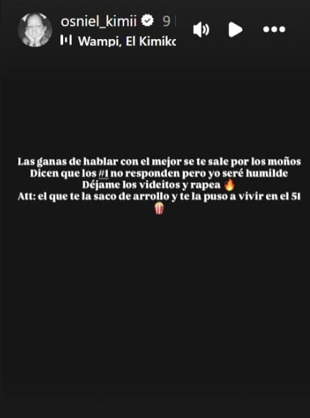 “Las ganas de hablar con el mejor se te salen por los moños. Dicen que los #1 no responden, pero yo seré humilde. Déjame los videítos y rapea. Att: el que te la sacó de Arroyo (Naranjo) y te la puso a vivir en el 51”, fue el otro texto que L Kimii colgó en sus historias después de que Wampi lo provocara desde Cuba diciéndole de manera indirecta que la polémica entre ambos habría hecho que se llenara el concierto del primero de ellos, celebrado el pasado 6 de septiembre en el Watsco Center de Miami, y que él es “el pasado, el presente y el futuro” de su ex.