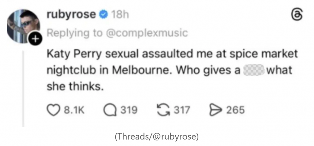 La actriz Ruby Rose acusó públicamente a la cantante Katy Perry de haber cometido una agresión sexual en un episodio que, según su versión, ya ha sido puesto en conocimiento de las autoridades.