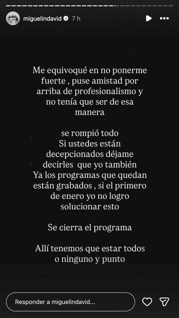 Tras la oleada de críticas y comentarios negativos, Miguelín reaccionó en sus historias de Instagram con un mensaje contundente y cargado de decepción. “Me equivoqué en no ponerme fuerte, puse amistad por arriba de profesionalismo y no tenía que ser de esa manera. Se rompió todo. Si ustedes están decepcionados, déjenme decirles que yo también”, escribió.