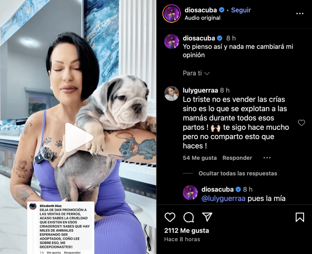 Todo comenzó cuando la artista recibió un mensaje de un seguidor que la cuestionaba duramente: “Deja de dar promoción a la venta de perros, ¿acaso sabes la crueldad que existe en esos criaderos? ¿Sabes que hay miles de animales esperando ser adoptados? Coño, lee sobre eso, me decepcionaste”.