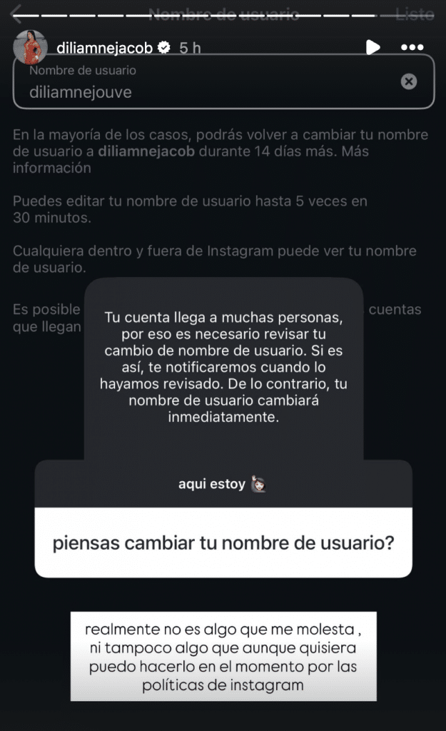 “Realmente no es algo que me molesta, ni tampoco algo que, aunque quisiera, puedo hacerlo en el momento por las políticas de Instagram”. En la historia que compartió, mostró que su solicitud de cambio de nombre se encuentra en revisión. La plataforma requiere un proceso de verificación más estricto cuando se trata de cuentas con gran alcance, lo que ha demorado la modificación.