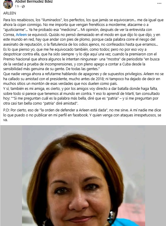 A esa defensa se sumaron publicaciones de otros usuarios en redes. El vicepresidente de la Unión de Periodistas de Cuba, Francisco Rodríguez Cruz, escribió una frase de respaldo que circuló en Facebook: “Ya quisieran sus detractores ser por un ratico una milésima de lo crítica e inconforme que es Arleen Rodríguez Derivet…”.