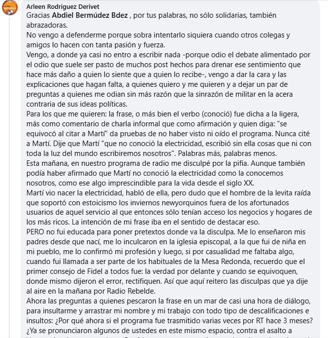 En ese hilo, la propia Arleen Rodríguez dejó un comentario extenso en el que afirma que “nunca citó a Martí”, atribuye el tropiezo al uso del verbo “conoció” “dicho a la ligera” y asegura que pidió disculpas en su programa de Radio Rebelde, además de sostener que su intención era remarcar que Martí no vivió la electricidad como un servicio cotidiano.
