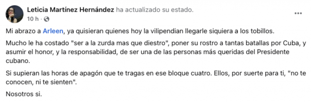 El apoyo de «mayor rango» en esta suerte de defensa tribal a pesar de lo terrible que resultó lo que dijo, lo explicitó Martínez Hernández, identificada en sus perfiles públicos como jefa de Comunicación de la Presidencia, cargo por el que recibe todos los meses, como lo recibía Boris Fuentes antes, cajas con embutidos, enlatados, viandas, granos, aceite etc., al escribir “Mi abrazo a Arleen, ya quisieran quienes hoy la vilipendian llegarle siquiera a los tobillos” y presentarla como una figura que “pone su rostro” en “batallas por Cuba”, en un contexto de críticas que se multiplicaron después de que circulara el clip con la frase “José Martí no conoció la luz eléctrica y era un genio… ojalá yo escribiera una línea como Martí con la luz encendida”.