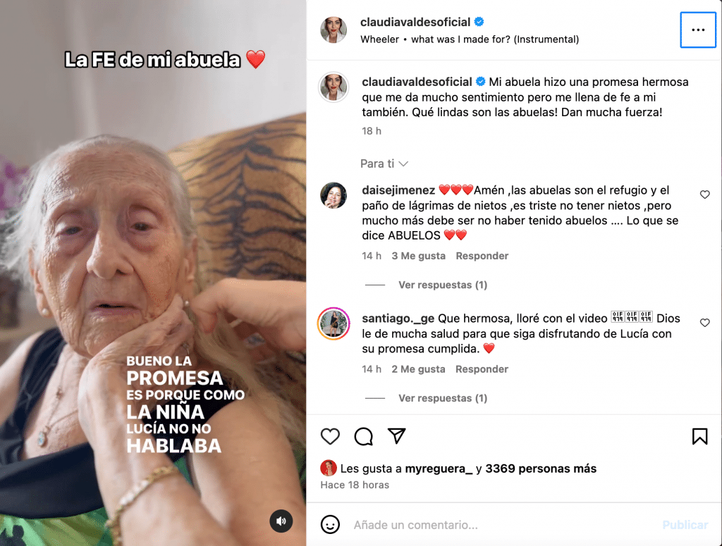 Los seguidores de Valdés reaccionaron con emotividad al video, dejando comentarios como: “Amén, las abuelas son el refugio y el paño de lágrimas de los nietos”, “Qué hermosa, lloré con el video. Dios le dé mucha salud para que siga disfrutando de Lucía”, “Fan de tu abuela, la amo”, y “Qué promesa tan linda de la abuelita, para bien de su biznieta y felicidad de su nietecita”.