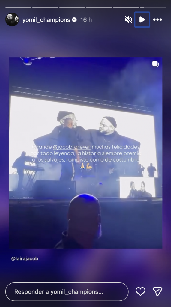 Al ver las imágenes, Yomil utilizó sus historias de Instagram para dedicarle unas palabras de respeto a «El Inmortal»: «Grande @jacobforever muchas felicidades por todo leyenda, la historia siempre premia a los salvajes, rompiste como de costumbre ».