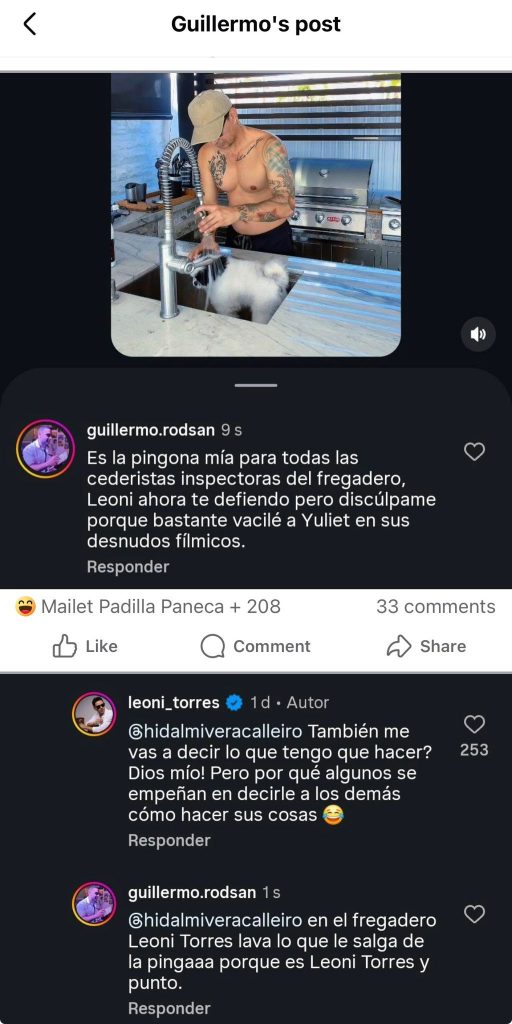 Uno de los comentarios que desató la polémica fue el de la usuaria Patricia Fleites, que opinó en el perfil de Instagram del siempre respetuoso Leoni: “Ni se lava el perrito en el fregadero ni se lava la cabeza de persona. Ahí se friegan legumbres, platos, cubiertos. Si tienes lavadero, ahí sí lavamos nuestros perritos. Adoro los perritos”.