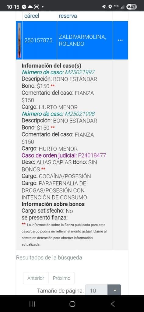 En los registros adjuntos figura como Zaldívar Molina, Rolando, nacido el 7 de septiembre de 1972. La ficha de custodia muestra cargos por hurto menor en dos causas y posesión de cocaína, junto a posesión de parafernalia con intención de consumo; se consigna además una orden judicial activa y fianzas de 150 dólares en los delitos menores. Los datos provienen de la búsqueda pública de internos del condado de Miami-Dade y coinciden con imágenes del propio registro divulgadas en redes por Alexander Otaola esta mañana.