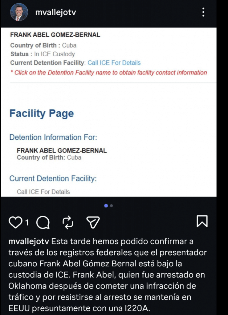 Vallejo publicó una captura del sistema federal Online Detainee Locator System (ODLS), herramienta oficial del Departamento de Seguridad Nacional, donde Frank Abel Gomez Bernal aparecía identificado como “In ICE Custody”, con Cuba como país de nacimiento. El registro, además, no especificaba centro de detención y mostraba la leyenda “Call ICE For Details”, una fórmula habitual cuando la agencia no hace pública la localización del detenido.