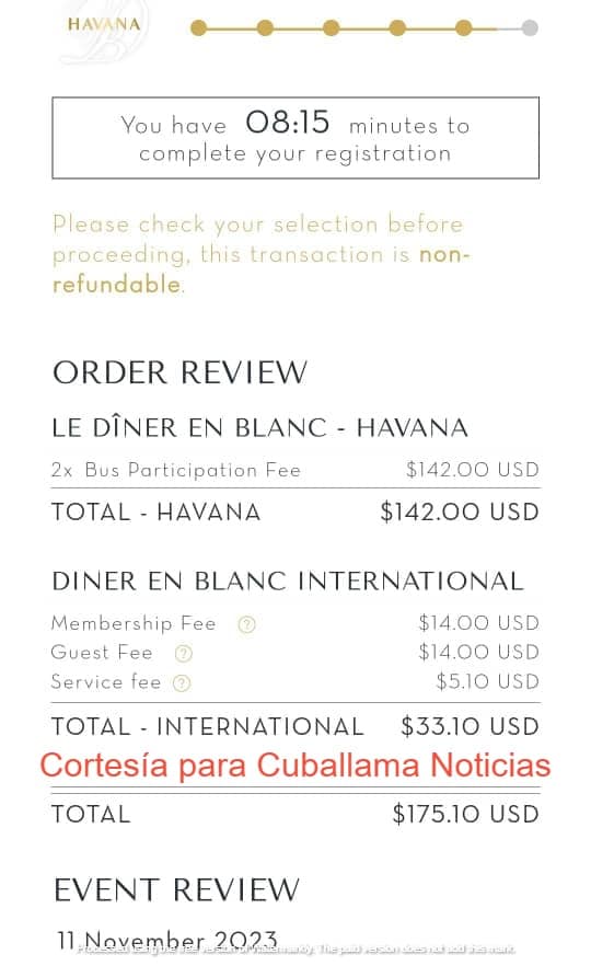 Gracias a una invitada al evento de Le Dîner en Blanc en La Habana, Cuballama Noticias tuvo acceso a parte del menú y un formulario de invitación a la velada, en la cual pueden verse los precios a los que se vende esta «exclusividad».