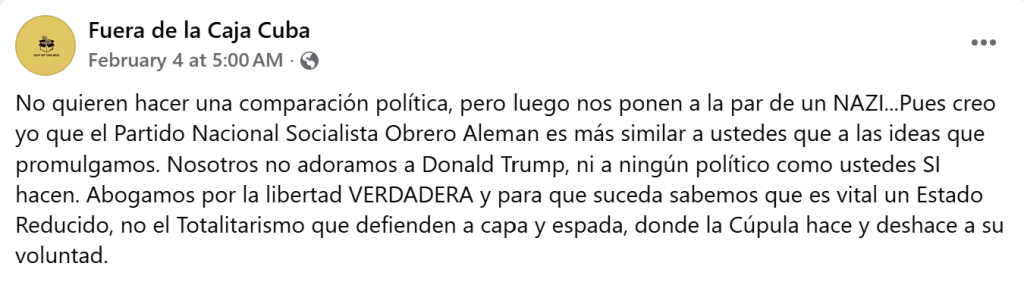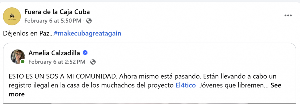 Sin embargo, la reacción social ha seguido un carril distinto. Las redes se han llenado de mensajes de apoyo tanto a El 4tico como a Fuera de la Caja Cuba, destacando que no se trata de proyectos clandestinos ni violentos, sino de iniciativas visibles que interpelan la realidad cubana desde el lenguaje cotidiano de una generación marcada por la emigración, la precariedad y la ausencia de canales institucionales de participación.
