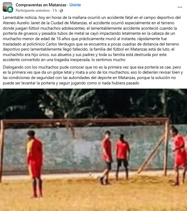 Un adolescente cubano de 16 años falleció en la mañana de este martes 26 de agosto en Matanzas tras caer sobre su cabeza una portería de futbol, según reportes en redes sociales.