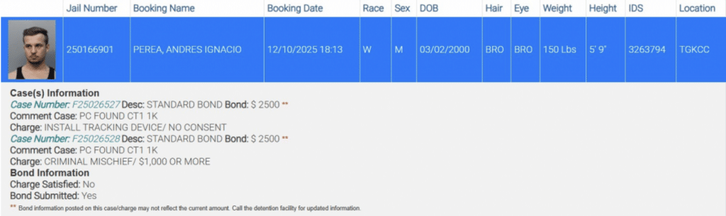 De acuerdo con el reporte citado por medios locales, la noche del 12 de octubre los agentes respondieron a la cuadra 10300 de la SW 119th St. después de que la víctima denunciara que Perea había destrozado su vehículo. La madre de la joven declaró que, unas dos semanas antes del acto vandálico, el teléfono de su hija había emitido una alerta de “AirTag cerca”. Al revisar el auto, ambas hallaron el localizador oculto en el guardafango.
