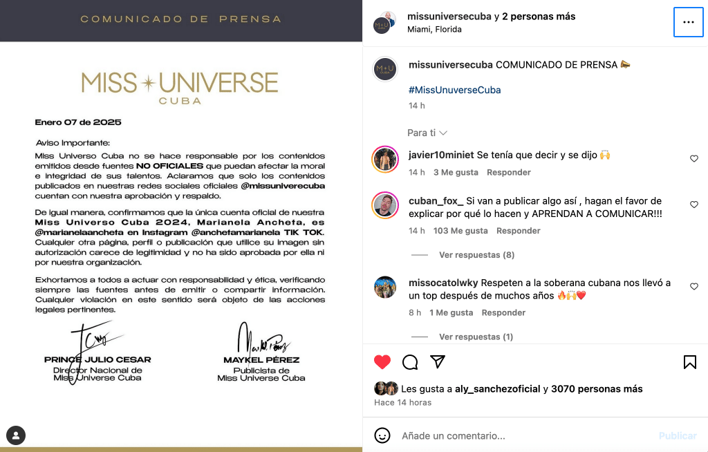En un comunicado desde su perfil oficial de Instagram, la organización aclaró que: “Miss Universo Cuba no se hace responsable por los contenidos emitidos desde fuentes NO OFICIALES que puedan afectar la moral e integridad de sus talentos”.