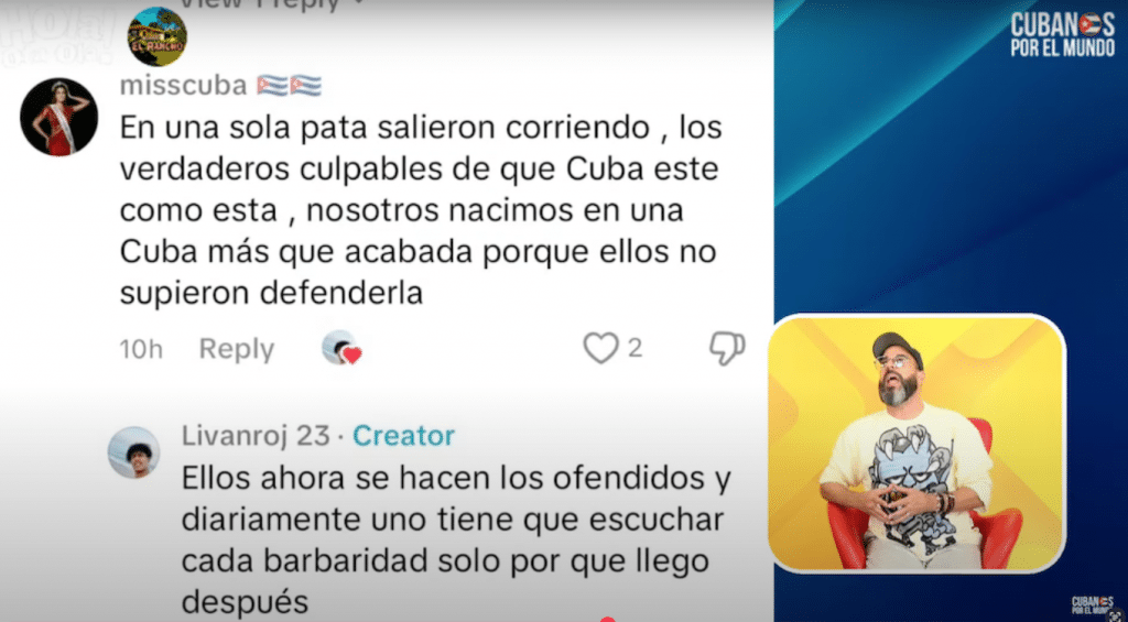 “En una sola pata salieron corriendo, los verdaderos culpables de que Cuba esté como está, nosotros nacimos en una Cuba más que acabada porque ellos no supieron defenderla”, se podía ver en el comentario compartido donde respaldaba una publicación que ataca al exilio histórico cubano.