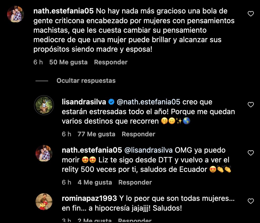 Incluso no faltó el comentario de la propia Lisandra que le contestó a una usuaria que también salió en su defensa haciendo referencia a las personas que hablaban acerca del tema: “creo que estarán estresadas todo el año! Porque me quedan varios destinos que recorrer”.