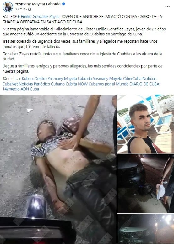 El motorista cubano Elieser Emilio González Zayas falleció en la tarde de este lunes tras chocar la noche anterior con un vehículo de la policía en Santiago de Cuba.