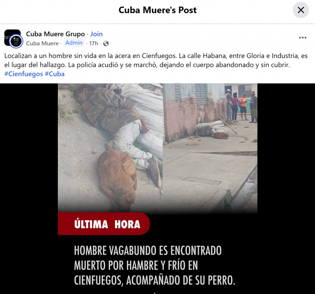 El estado cubano y el parte del tiempo suelen hablar de cosas distintas, pero esta semana volvieron a cruzarse en el mismo punto: la intemperie. Mientras especialistas advierten que el frío no se ha ido del todo y que pudiera entrar otra masa de aire de origen ártico con un frente asociado entre el domingo 22 y el lunes 23 de febrero, en redes sociales circuló la denuncia del hallazgo de un hombre sin vida en una acera de Cienfuegos, en la calle Habana entre Gloria e Industria, con el señalamiento de que la policía acudió y se marchó dejando el cuerpo sin cubrir.