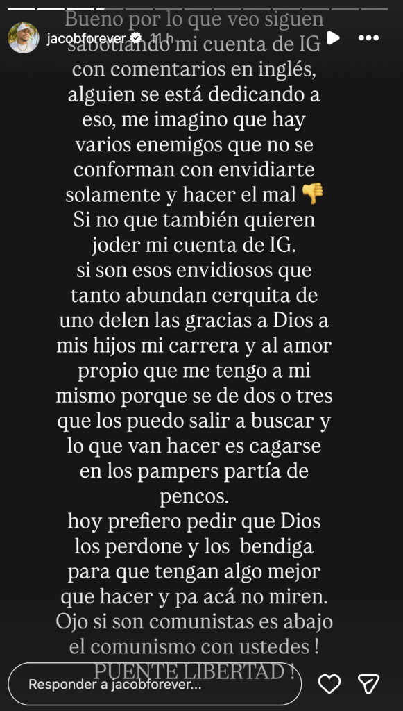 A través de una serie de historias de Instagram, el artista señaló que alguien está inundando sistemáticamente su perfil con comentarios en inglés, una táctica que, según él, está dirigida a afectar el algoritmo de la plataforma y alejarlo de su audiencia natural hispanohablante. “Por lo que veo, siguen saboteando mi cuenta con comentarios en inglés”, escribió Jacob, dejando claro que no cree que se trate de un acto aislado sino de una acción coordinada. “Alguien se está dedicando a eso”, añadió.
