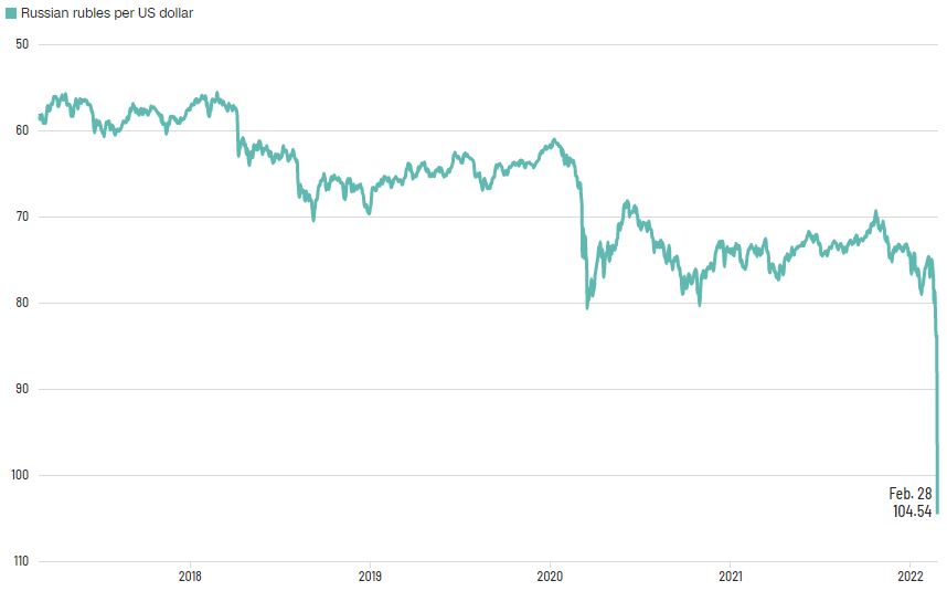 La moneda se desplomó luego de que las naciones occidentales acordaran el sábado imponer sanciones al sector financiero del país en represalia por su invasión de Ucrania, indica el portal CNN Finanzas.