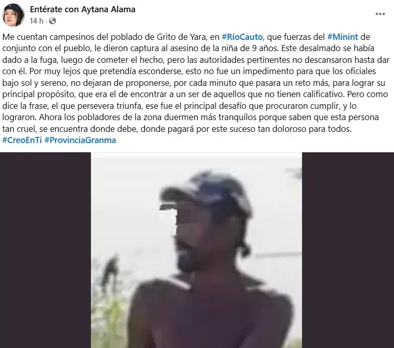 Otros perfiles oficialistas en Facebook, como «Entérate con Aytana Alama», indicaron que campesinos de la zona en Granma colaboraron con las fuerzas del MININT para dar con el paradero del sospechoso, quien había intentado escapar luego de cometer el crimen de la niña.