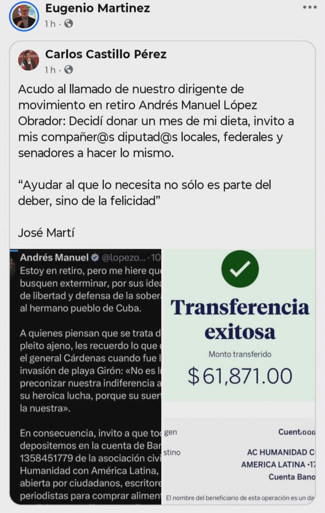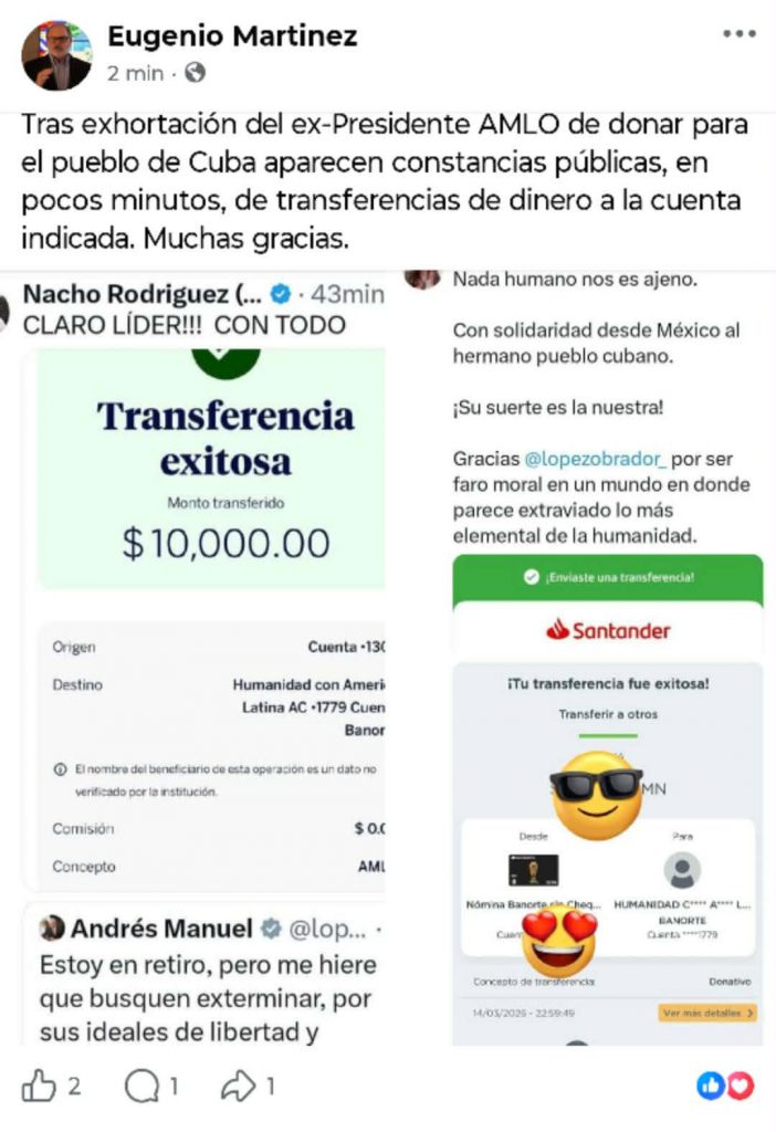 La reacción de Ferriz se produjo tras un mensaje publicado por López Obrador en su cuenta de X, donde afirmó sentirse indignado por la situación del pueblo cubano y convocó a realizar aportes económicos para financiar la compra de alimentos, medicinas y combustible destinados a la isla. El llamado fue interpretado por sus críticos como una nueva muestra de cercanía política con el gobierno cubano.